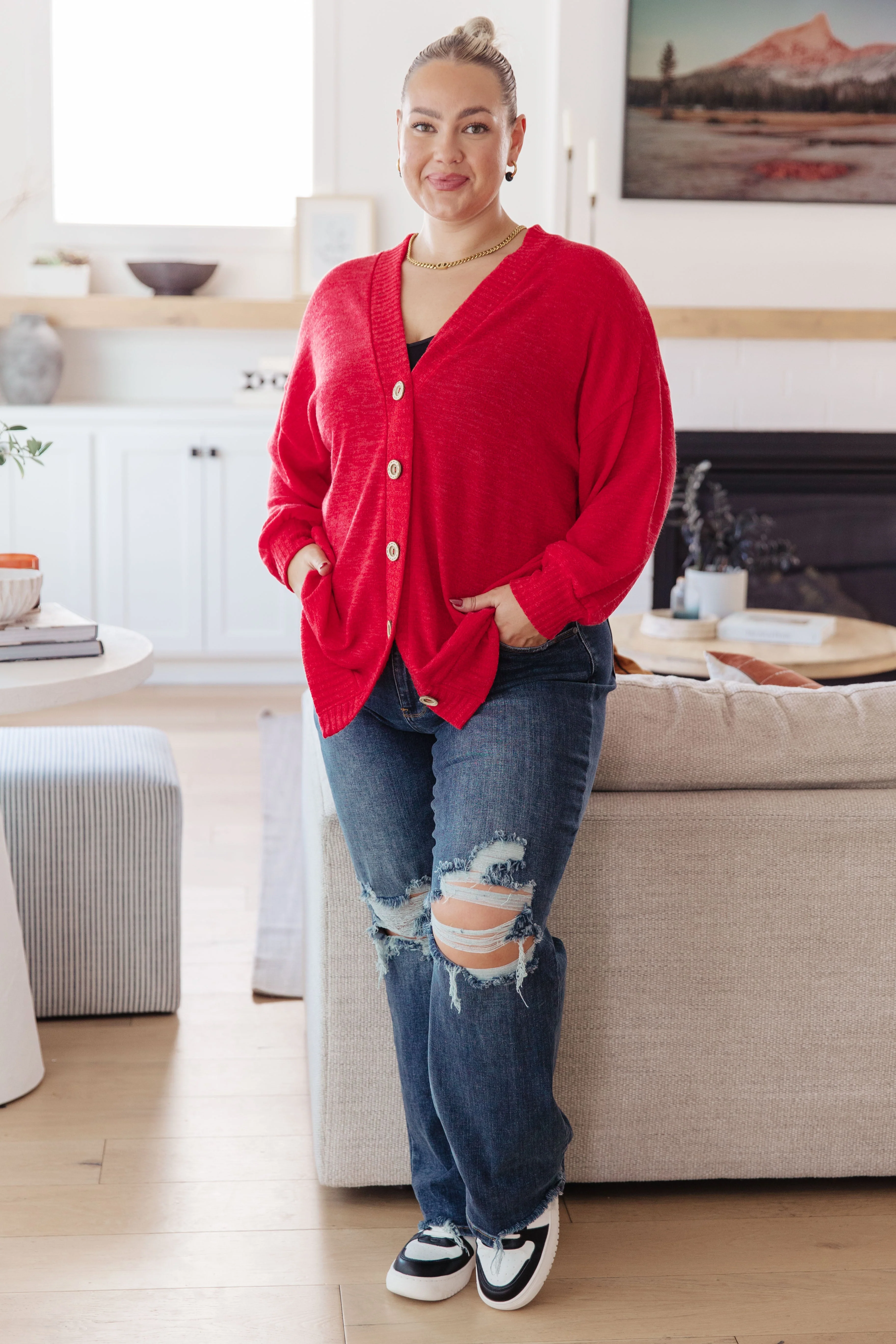 This Be My Neighbor Cardigan is a must-have for any wardrobe. Crafted from sweater knit, it has wood buttons and ribbed trim for a classic look. The classic grandpa cardigan features a v-neckline and ribbed cuffed hem for a timeless style. Embrace your inner cozy style today!