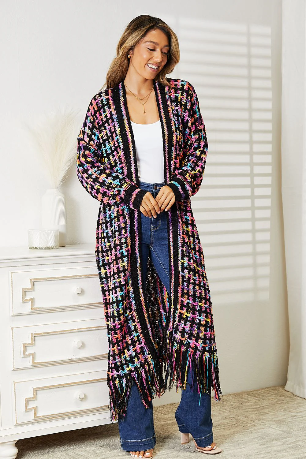 Wrap yourself in style with this Multicolored Open Front Fringe Hem Cardigan. The playful mix of colors and the trendy fringe hem create a bohemian and chic look that is perfect for layering over any outfit.