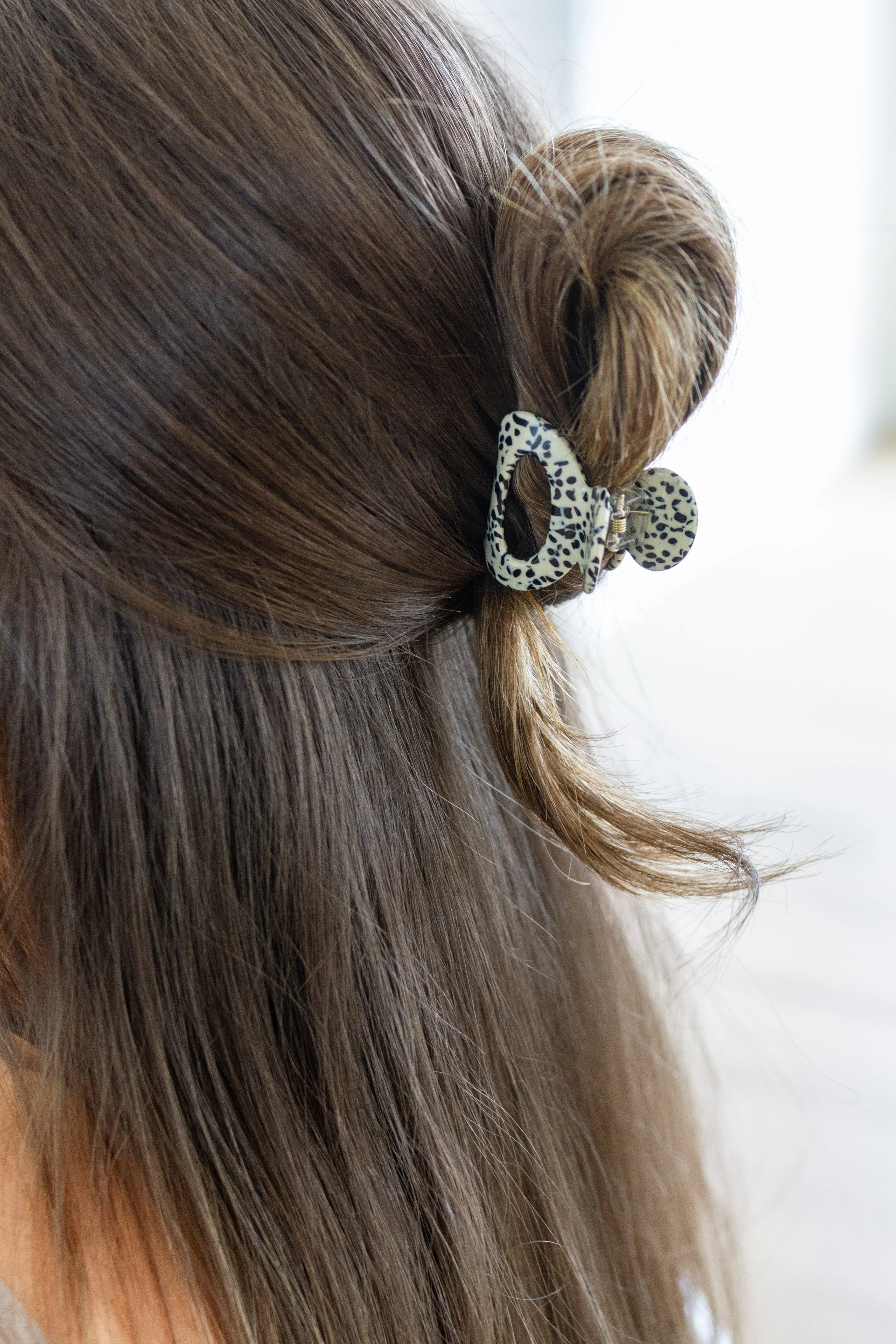 The Happy Daydreams Round Claw Clips Set of 2 is an adorable hollow round claw clip set in shades of black and white?speckled?and marbled purple.