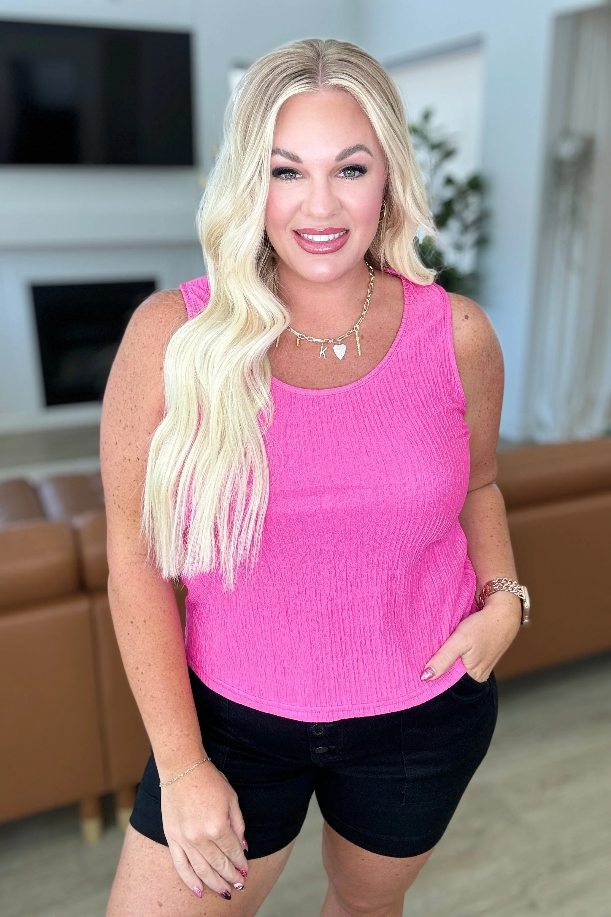 Don't fret! Our Not A Worry Textured Tank has got your back (and front)! Made with high stretch crinkle poly for the perfect layering piece. And a scoop neck for a flattering fit. Go ahead, add it to your wardrobe. You won't regret it!